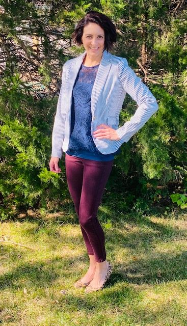 A cute blazer is a quick way to dress up any outfit and can be worn so many ways. Another great find at TJ Maxx, this white blazer with navy pin stripes is perfect for the transition from summer to fall or winter to spring. If you want to be a bit more creative and show some personality in any outfit, add some fun shoes like the leopard print heels in shot two!