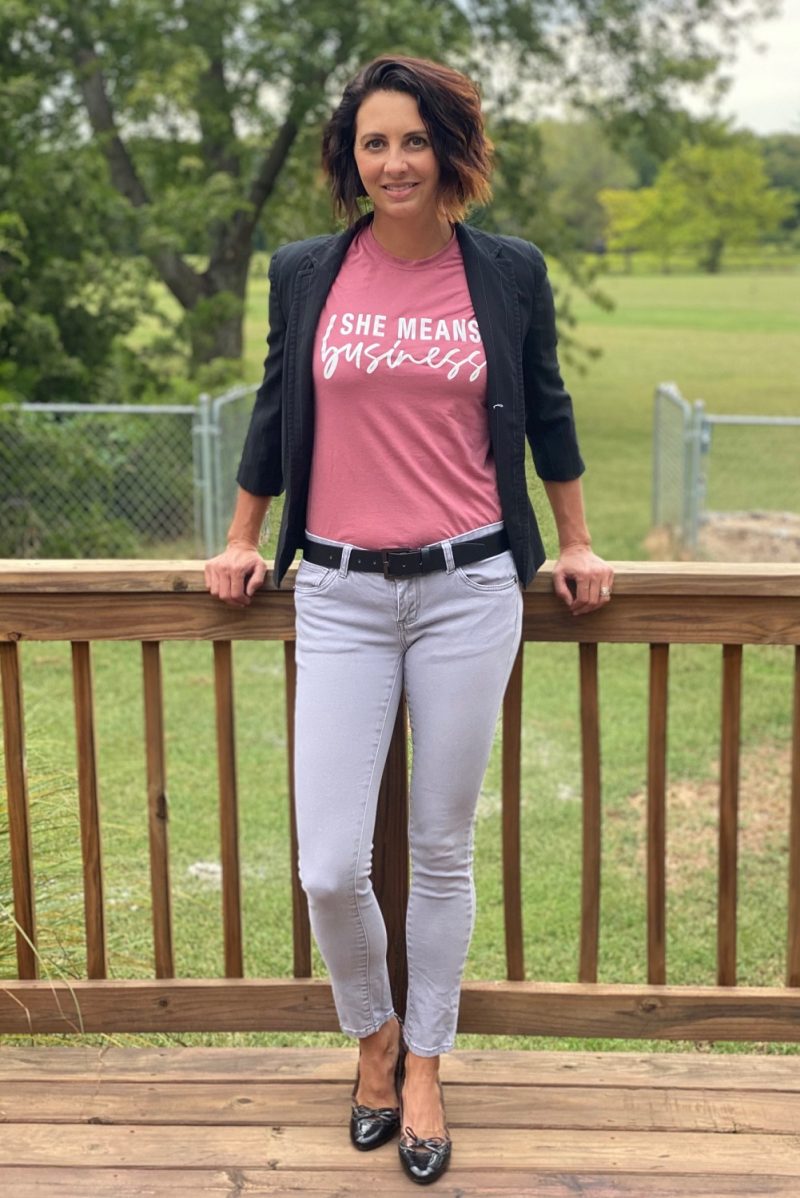 T-shirt (free as part of an event), black blazer (birthday gift), gray pants ($10.00), gray pencil skirt ($10.00 – bought from a friend)